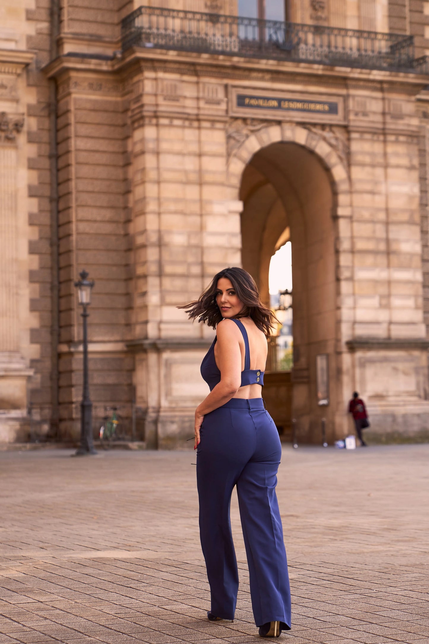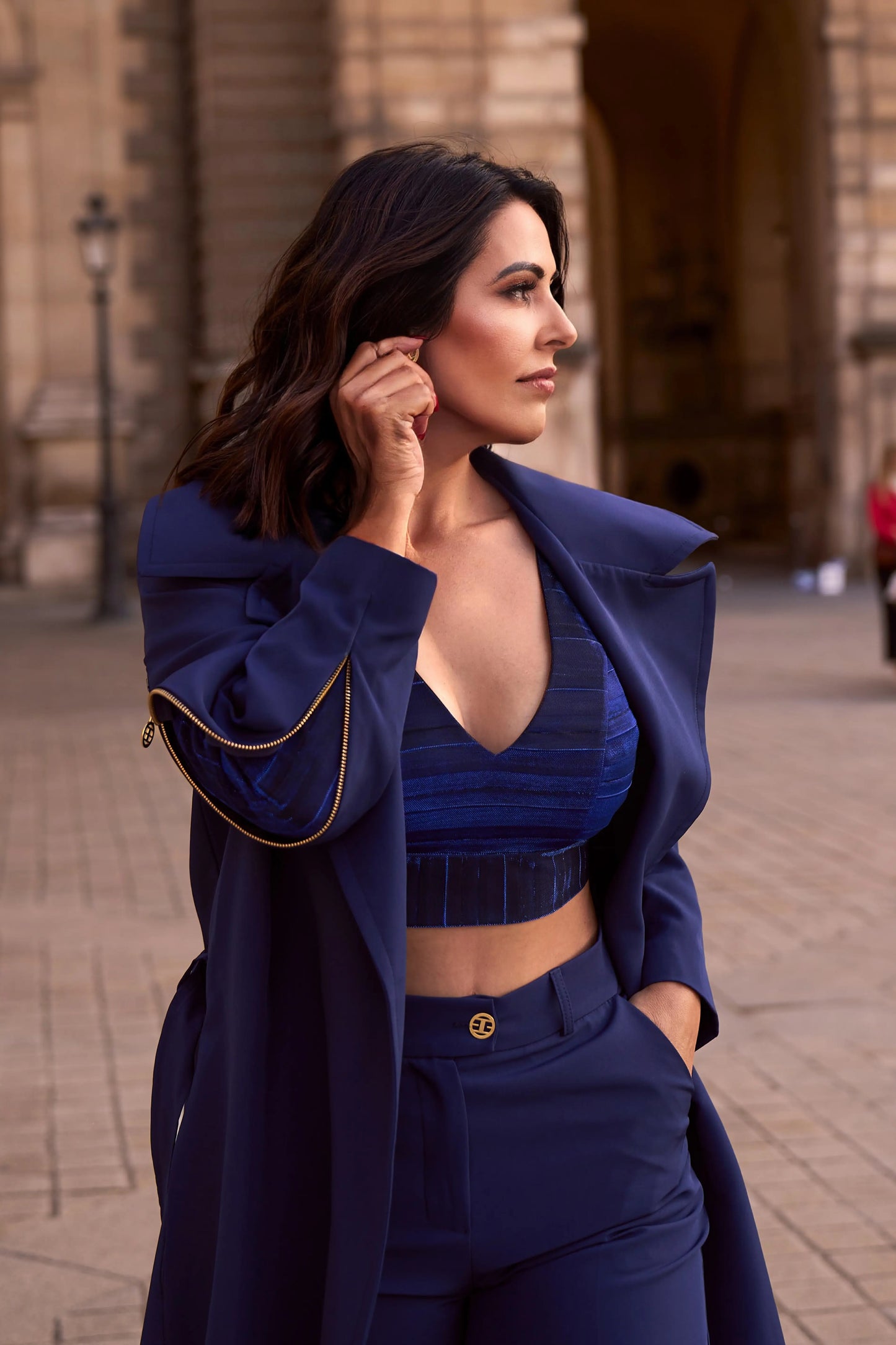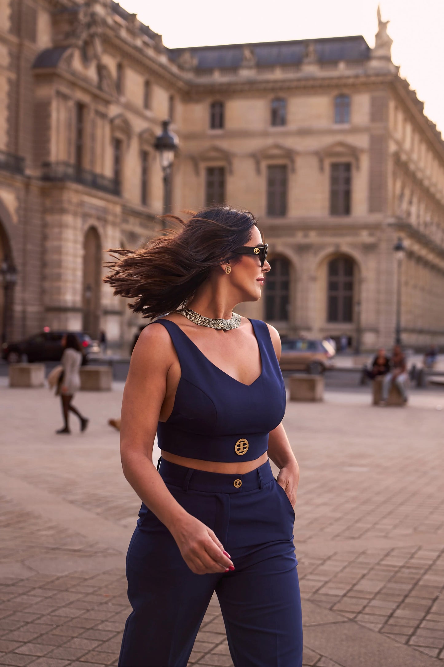 Parte superior de crepe; Escote en pico con tirantes anchos; Se abrocha en la espalda con un botón de la marca bañado en oro;